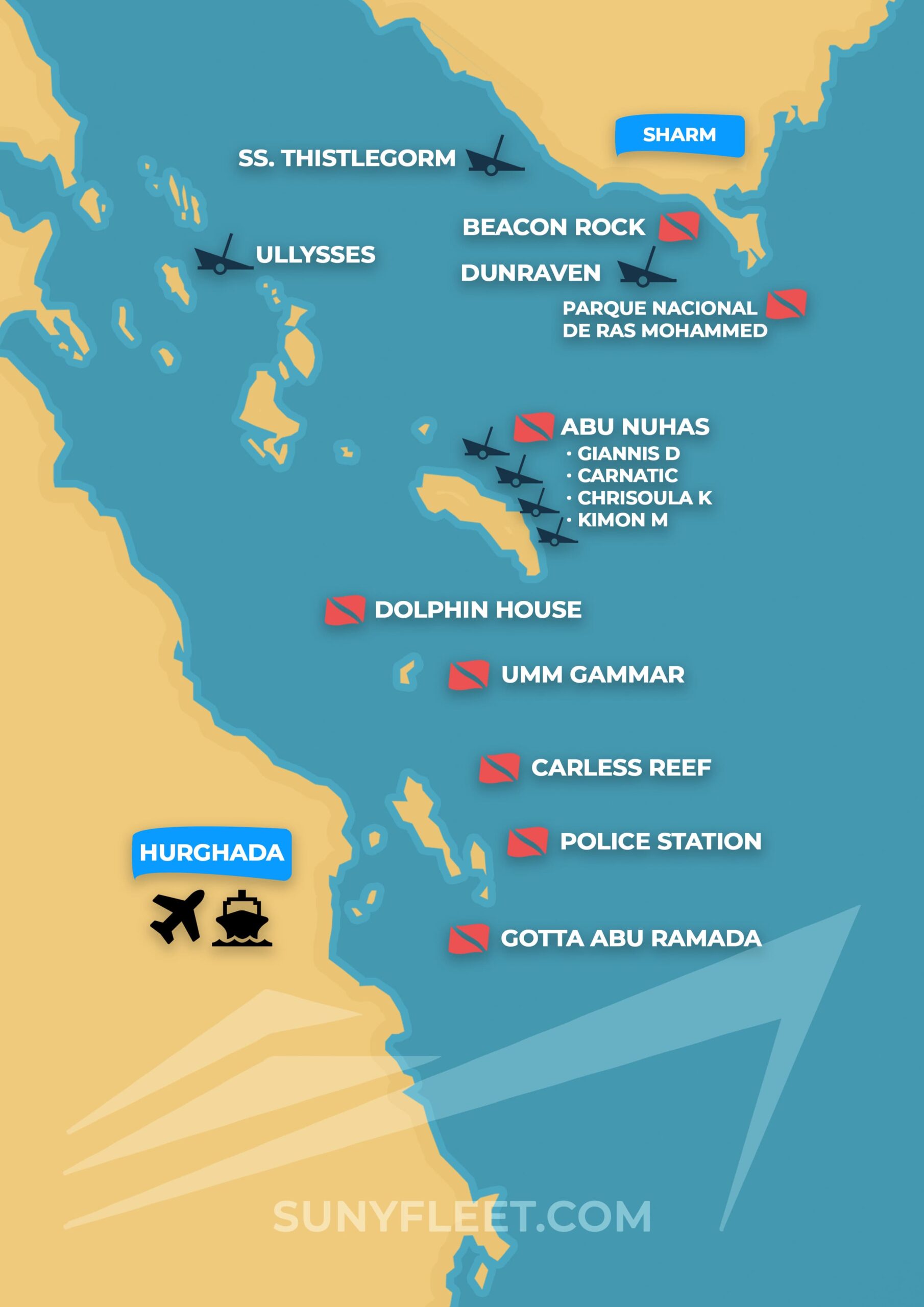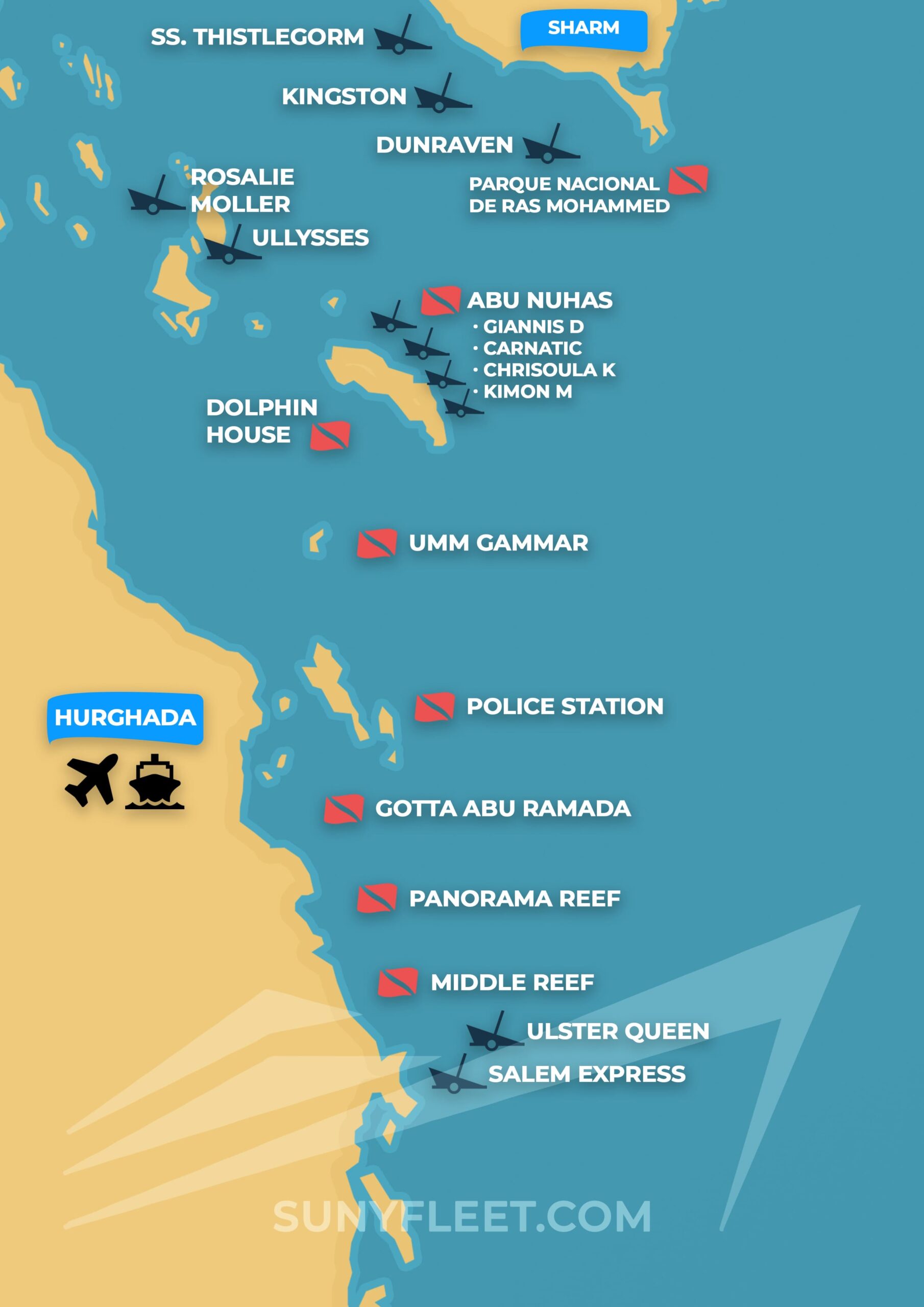 Un safari de buceo de una semana que comienza y termina en Hurghada y se concentra en algunos de los mejores naufragios del mundo, como Dunraven, el naufragio Thistlegorm de la Segunda Guerra Mundial y los naufragios de Abu Nuhas.
